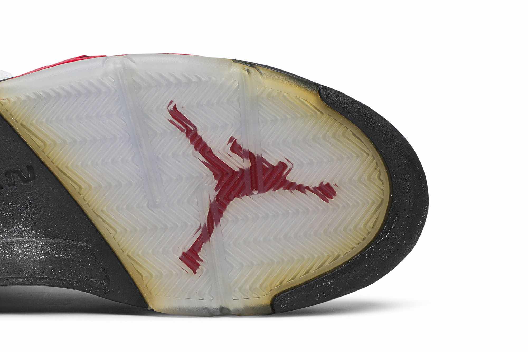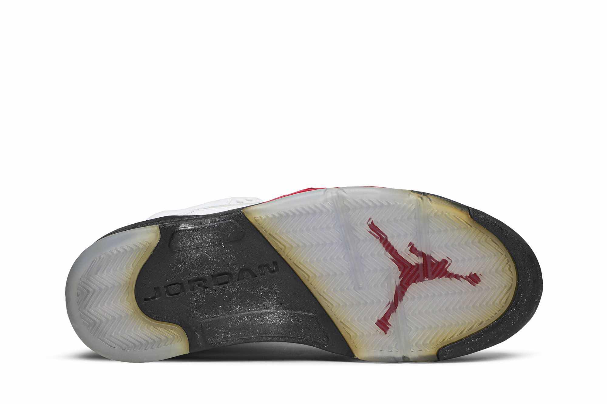 The Nike Air Jordan 5 Retro ‘White Fire Red’ features a white leather upper, metallic silver 3M reflective tongue, and Fire Red accents. The sneaker also includes a black midsole with red shark teeth and a translucent outsole. Released in January 2013, the ‘Fire Red’ was joined by a black-tongued iteration with alternate midsole color blocking in August 2013.