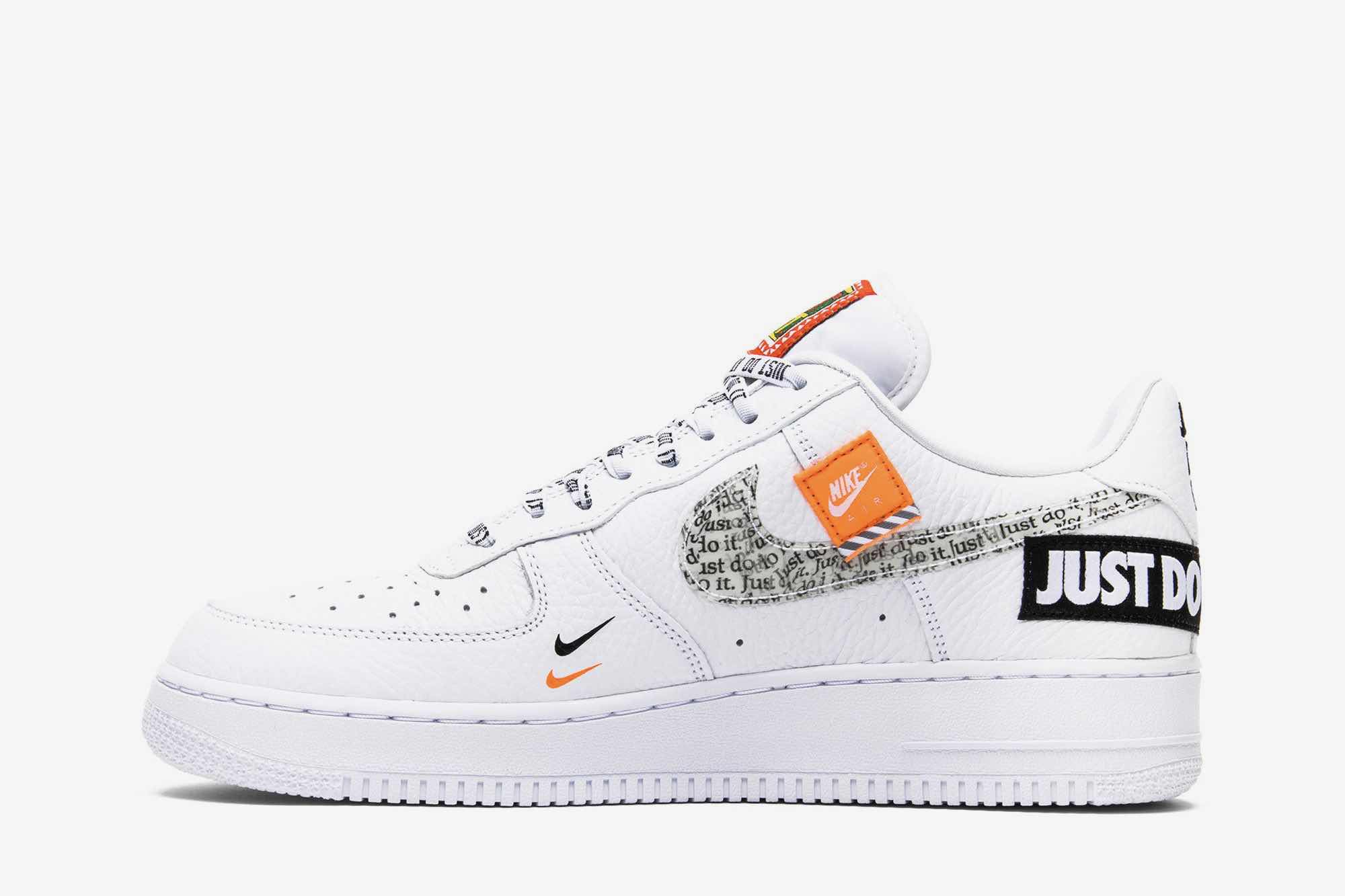 Nike dropped the Air Force 1 07 PRM JDI as part of its “Just Do It” collection in June 2018. The shoe celebrates Nike’s iconic “Just Do It” slogan, which has been motivating athletes and everyday people for 30 years. The Air Force 1 07 PRM JDI features a white leather upper adorned with the original 1988 “Just Do It” campaign’s green and orange iconography. This includes a mismatched Swoosh on each shoe, an orange Nike Air patch on the toe and quarter panel, and a large black banner around the heel that reads “JUST DO IT.” The tongue tag also pays tribute to the campaign with its green and orange colors and bold font.