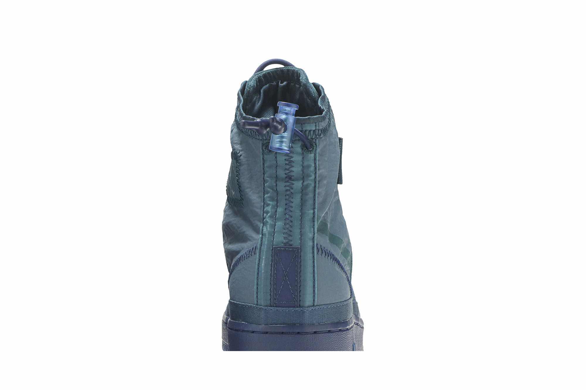 The Nike Wmns Air Force 1 High Shell takes design cues from technical outerwear. Emerged in October 2019, this women’s version protects the foot in a water-repellent turquoise textile upper designed with a Sherpa footbed, an adjustable collar and premium laces. Jacket styling is interpreted by sprayed Swooshes, zigzag stitching and mudguard webbing. Its Air-cushioned rubber cupsole assumes a tonal finish.