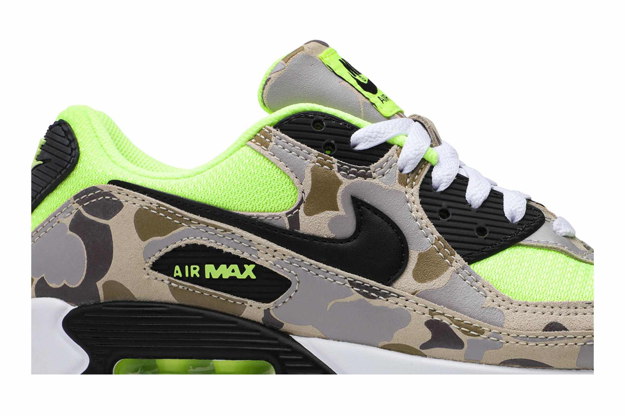 Nike Air Max 90 Green Camo Following on from 2013’s Atmos Duck Camo edition, this Nike Air Max 90 features a volt mesh base with duck camouflage overlays on the mudguard, midfoot, and tongue.