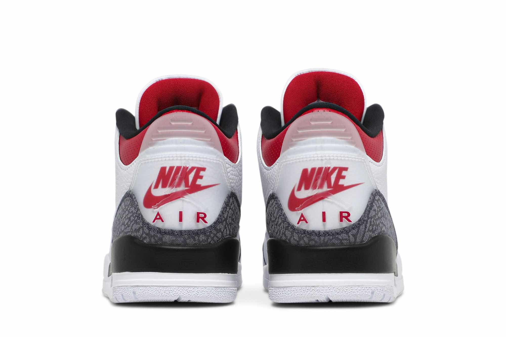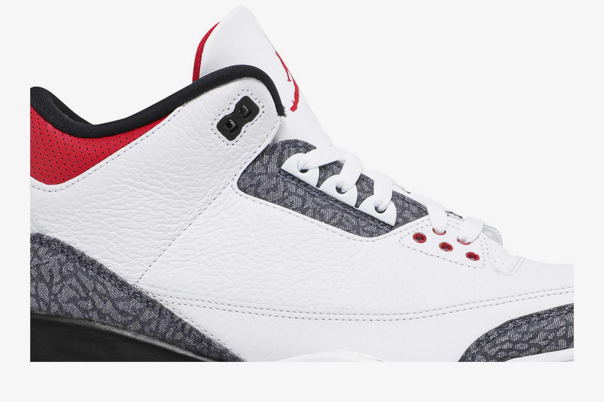 As part of Jordan Brand’s Summer 2020 lineup, the Air Jordan 3 Retro Denim “Fire Red” features a white leather upper accented by the signature elephant print. Special details include the translucent heel tab with red Nike branding on it.