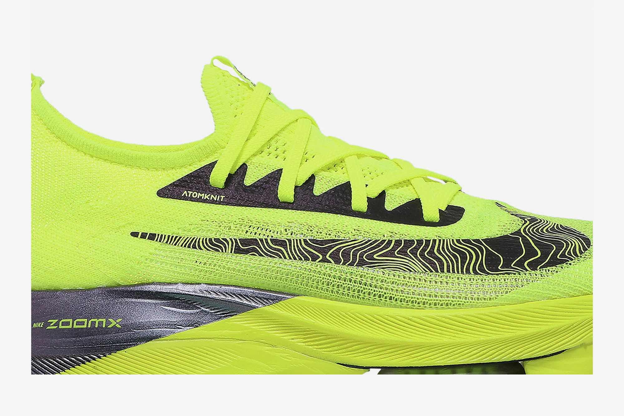 The Nike Air Zoom Alphafly NEXT% ‘Volt’ applies a visually arresting palette to the brand’s pinnacle running shoe. In addition to the neon hue, the lightweight and breathable AtomKnit upper is further enlivened with an oversized Swoosh covered in topographic lines. The radiant finish extends to the responsive ZoomX foam midsole, enhanced with a full-length carbon fiber plate and supplemented with visible Zoom Air pods under the ball of the foot.