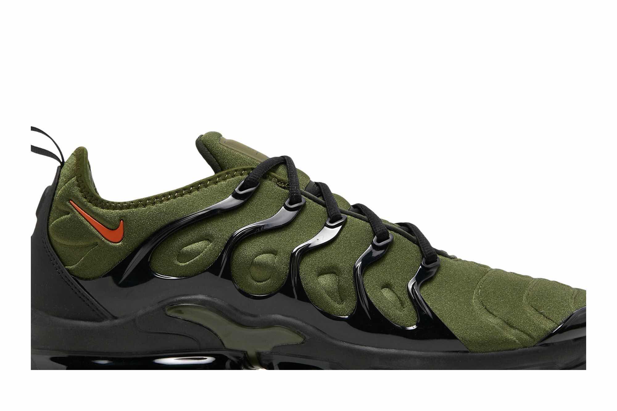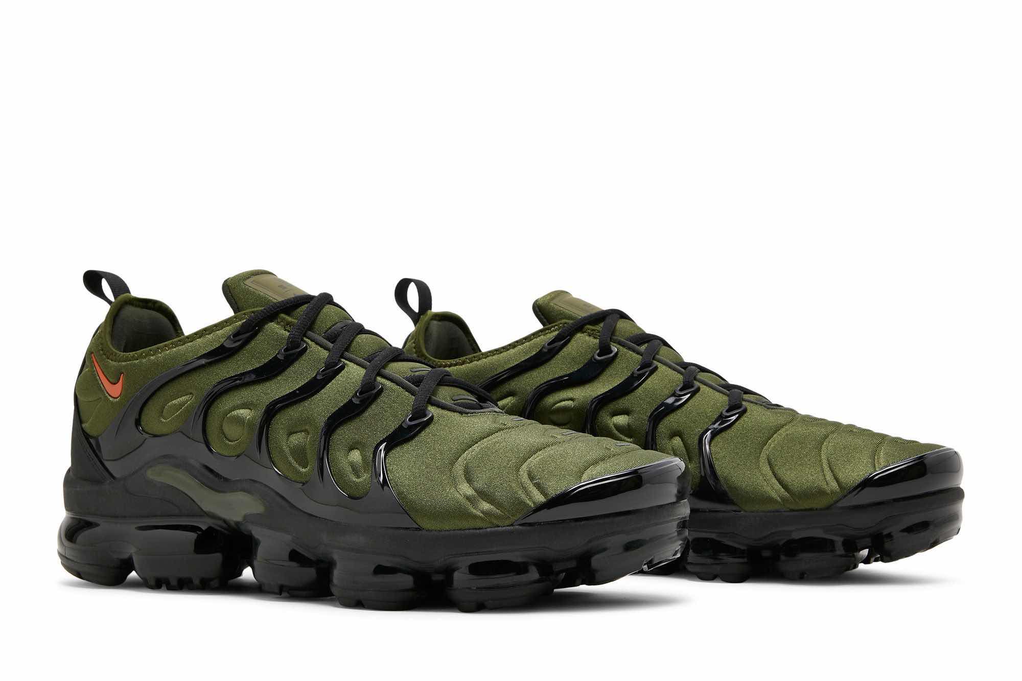 Make a stylestatement with theNike Air VaporMax Plus ‘Rough Green’. This military-inspired hybrid silhouette is sure to turn heads with its unique olive green hue and textured upper. The glossy black TPU cage and reflective detailing add an extra touch of edge, while the orange mini-Swoosh brings a pop of color. The heel overlay features a ‘Vm’ emblem, inspired by the retro Tuned Air logo. And for superior cushioning, the black VaporMax midsole provides unbeatable comfort. Whether you’re hitting the streets or the gym, the Nike Air VaporMax Plus ‘Rough Green’ is a must-have addition to your wardrobe.