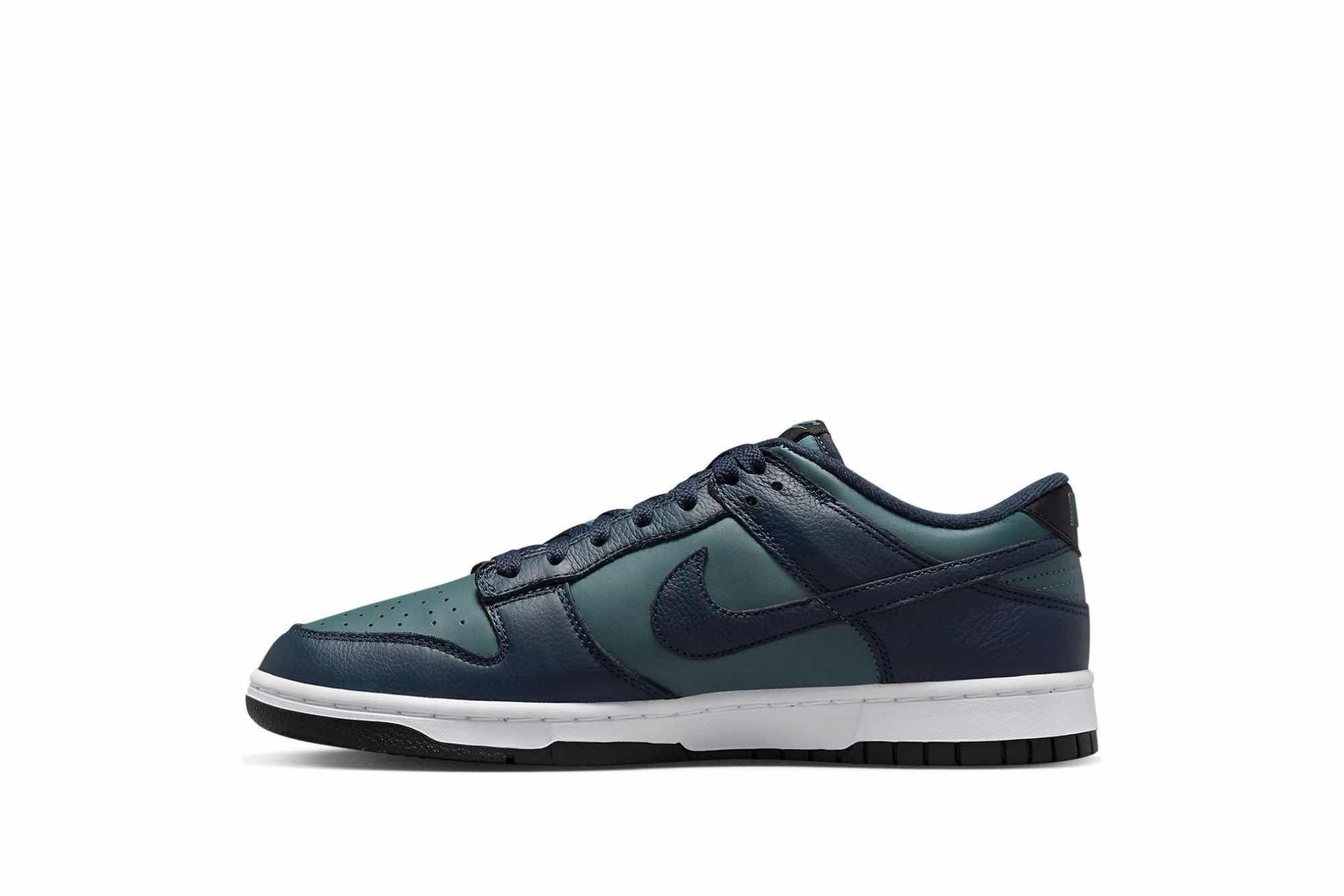 The Nike Dunk Low Premium ‘Armory Navy’ showcases nuanced hues and textures on the classic basketball shoe turned modern wardrobe essential. The low-top sports a smooth leather upper in Mineral Slate, contrasted by navy tumbled leather overlays and a color-matched signature Swoosh. Standard Nike branding hits settle on the woven tongue tag, sockliner, and back tab. The sneaker sits atop a stark white midsole, enhanced with a foam wedge and supported by a navy rubber outsole.
